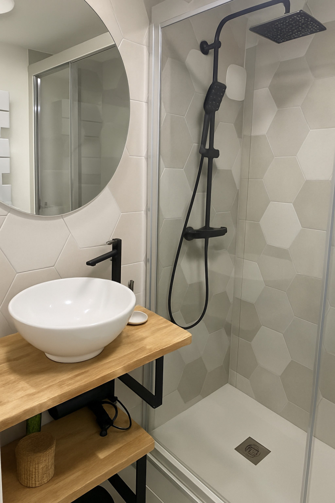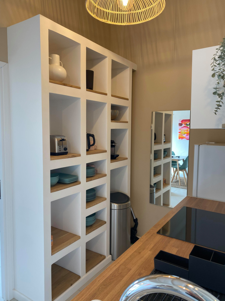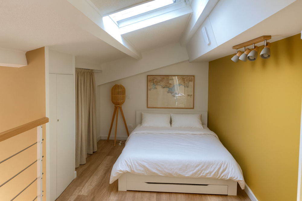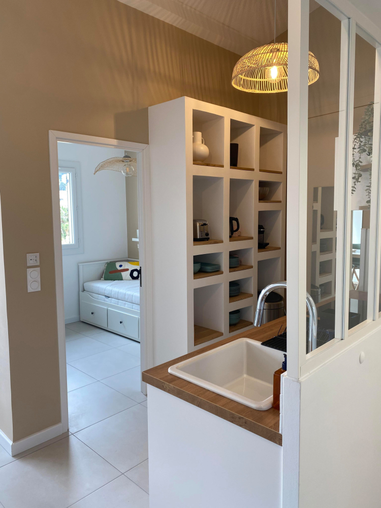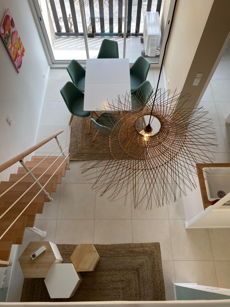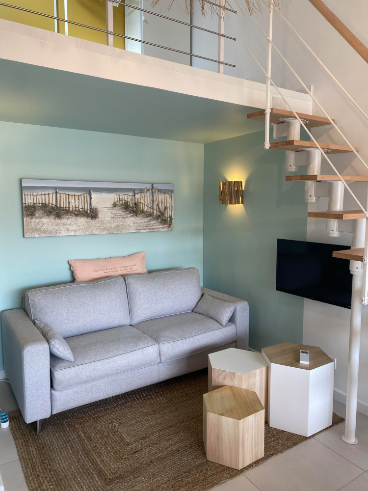 Cet appartement en duplex de type T3 a fait l’objet d’une rénovation complète, pensée pour mêler fraîcheur littorale, lignes épurées contemporaines, et une pointe de poésie architecturale, rappelant l’univers délicat d’une maison de poupée moderne.